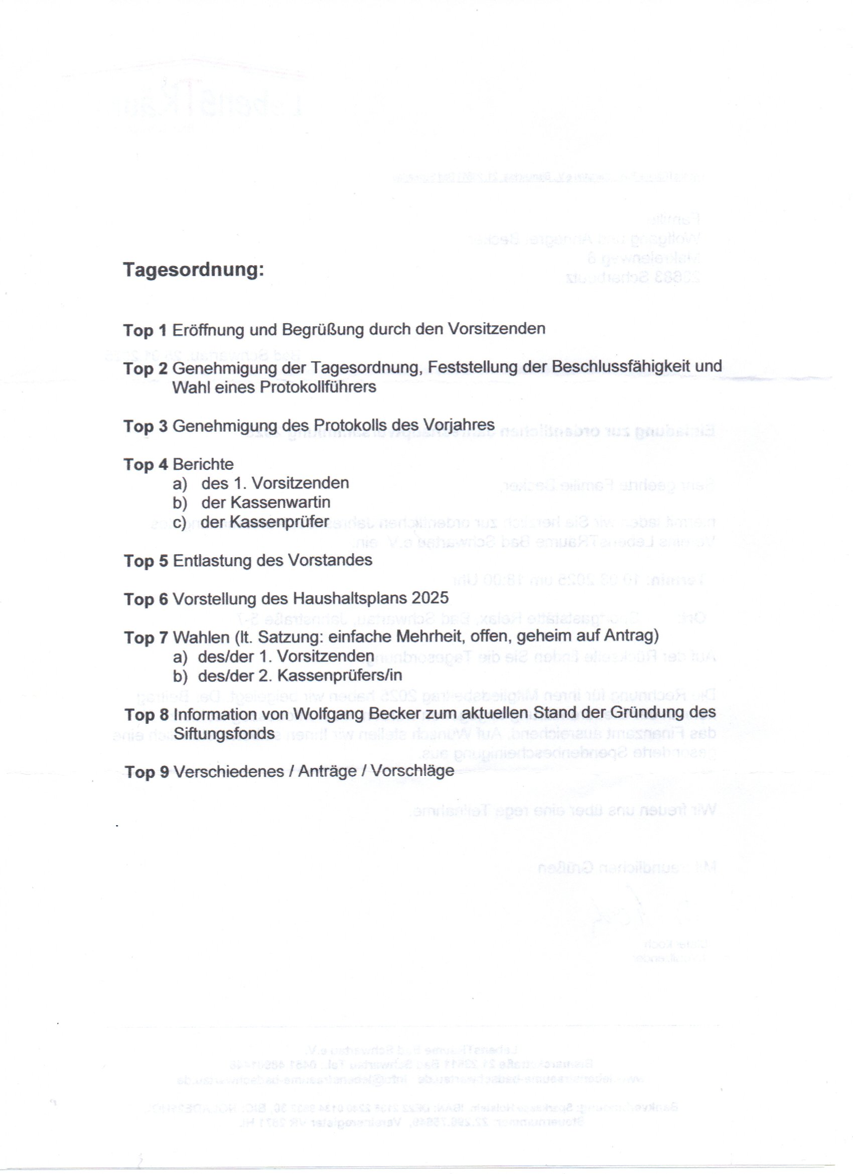 Die diesjährige Jahreshauptversammlung findet am 10. März 2025 ab 18.00 Uhr in der Sportgaststätte Relax in Bad Schwartau, Jahnstraße 5-7 statt.