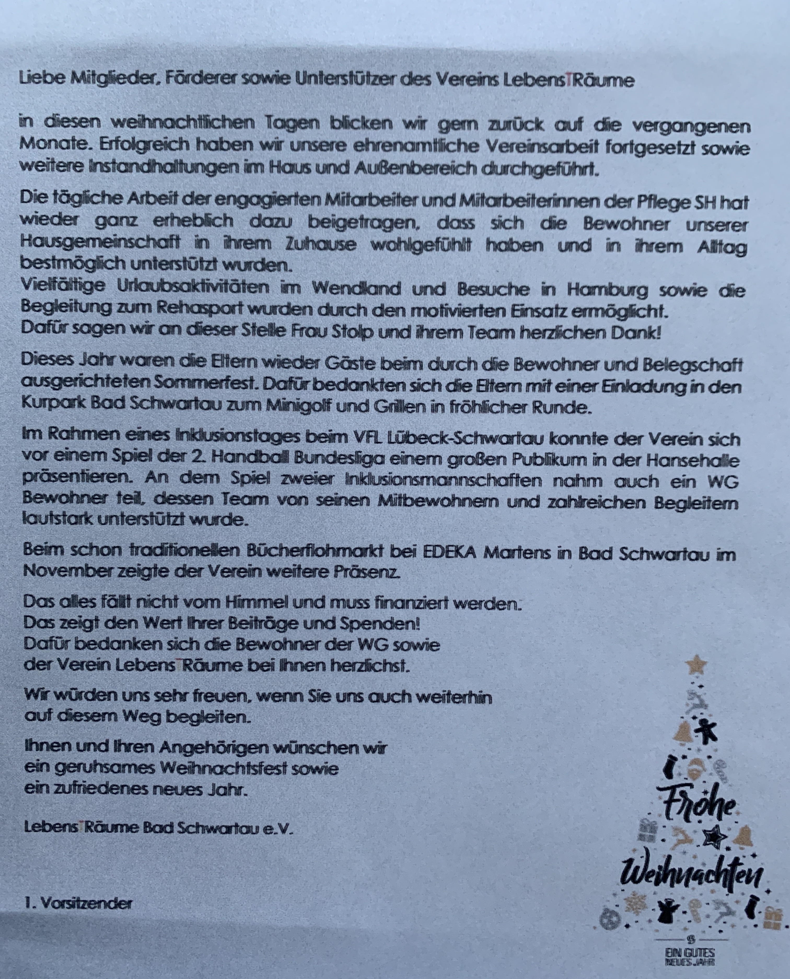 Im Oktober hatten mehrere Mitarbeitende der Deutschen Bank Filiale Bad Schwartau im Rahmen ihres Projektes Engagement beweisen unsere Hausgemeinschaft tatkräftig bei der Gartenarbeit unterstützt. Darüber hinaus wurde durch die Bankfiliale ein Geldbetrag zur Unterstützung gemeinnütziger Zwecke gesammelt.Am 5. Dezember 2023 kamen Frau Paarmann und der Filialdirektor Herr Freund in unsere WG und übergaben zu unserer Freude einen symbolischen Scheck in Höhe von 800 Euro.